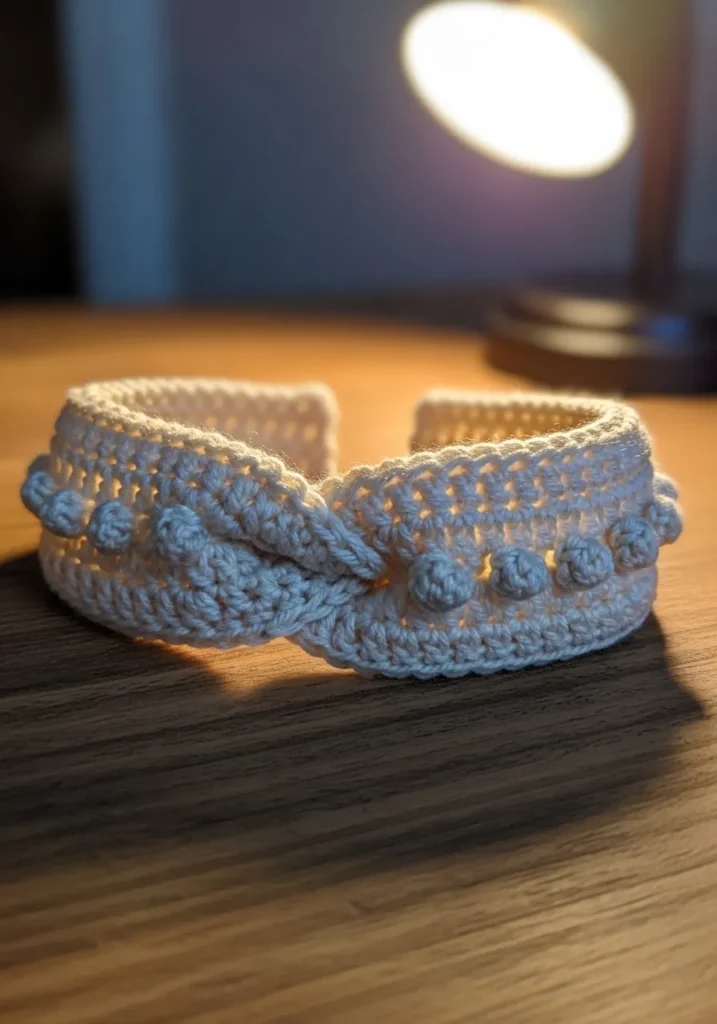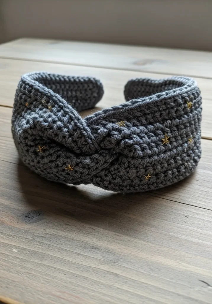 This crochet headband features a gentle twist at the front with small pearl like beads stitched into a soft gray yarn. The stitches are tight and even, giving it a cozy but refined look that feels slightly dressed up. The neutral color keeps it elegant while the pearls add just the right hint of charm.
