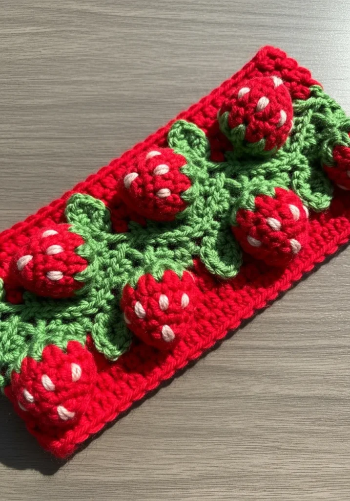 This bright red crochet headband is covered with adorable raised strawberry motifs in red and green, complete with tiny white stitch details. The texture is wonderfully bumpy and fun, and the bold colors make it instantly eye catching. It has such a cheerful handmade vibe.