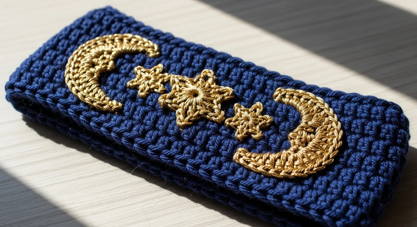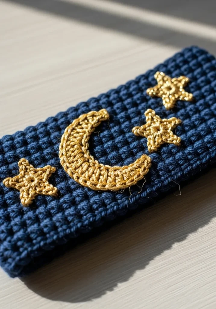 This navy blue crochet headband features golden crescent moons and tiny star appliqués stitched across the front. The contrast between the dark base and metallic accents gives it a dreamy, night sky feel. The stitches are neat and structured, making the design feel clean and intentional.
