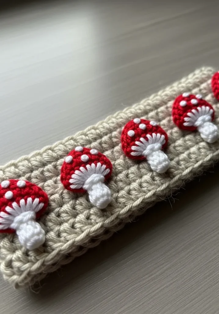 This cozy cream crochet headband is decorated with a row of tiny red and white mushroom appliqués that pop beautifully against the soft base. The stitches are slightly textured, giving the band a warm handmade feel, while the little mushroom caps bring in a fairy tale vibe. It feels earthy, cute, and just a little bit magical.