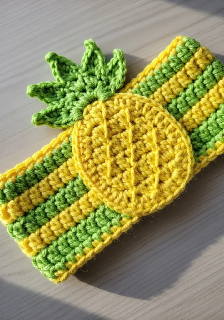 Bright yellow and green stripes form the base of this cheerful crochet headband, topped with a bold pineapple appliqué complete with textured stitching and leafy green crown. The ribbed band gives it structure, while the vibrant fruit motif makes it a true statement piece. It feels sunny and full of personality.