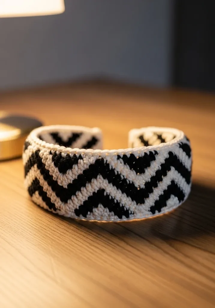 This crochet headband showcases a striking black and cream chevron pattern that instantly draws the eye. The stitches are tight and clean, giving the band a structured feel, while the high contrast colors make the zigzag design pop beautifully. It feels modern and stylish without being over the top.