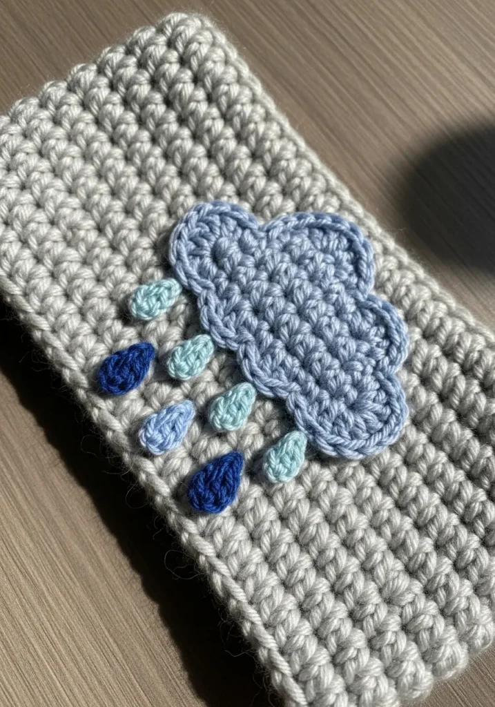 Soft cream yarn forms the base of this cozy headband, topped with a light blue crochet cloud and tiny dangling raindrop appliqués in varying shades of blue. The stitches create a gentle texture, and the playful weather theme adds a whimsical touch that feels dreamy and cute.