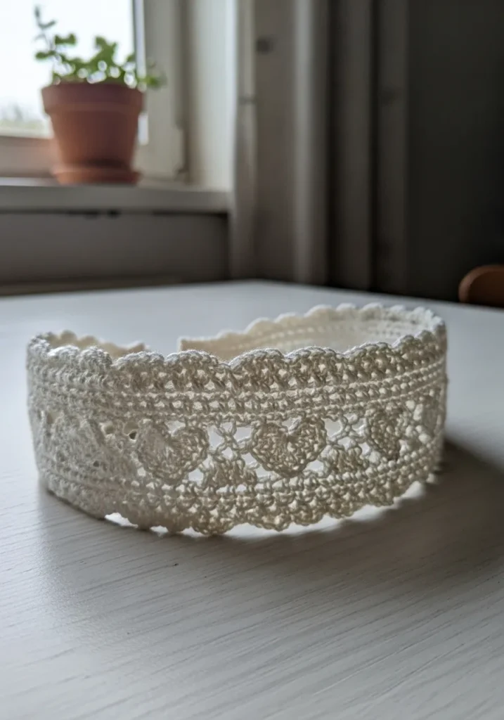 This elegant crochet headband is worked in creamy white yarn with a lace like stitch pattern that creates intricate openwork details all around. The texture is light and airy, giving it a refined and almost vintage feel. It looks soft, feminine, and beautifully detailed.