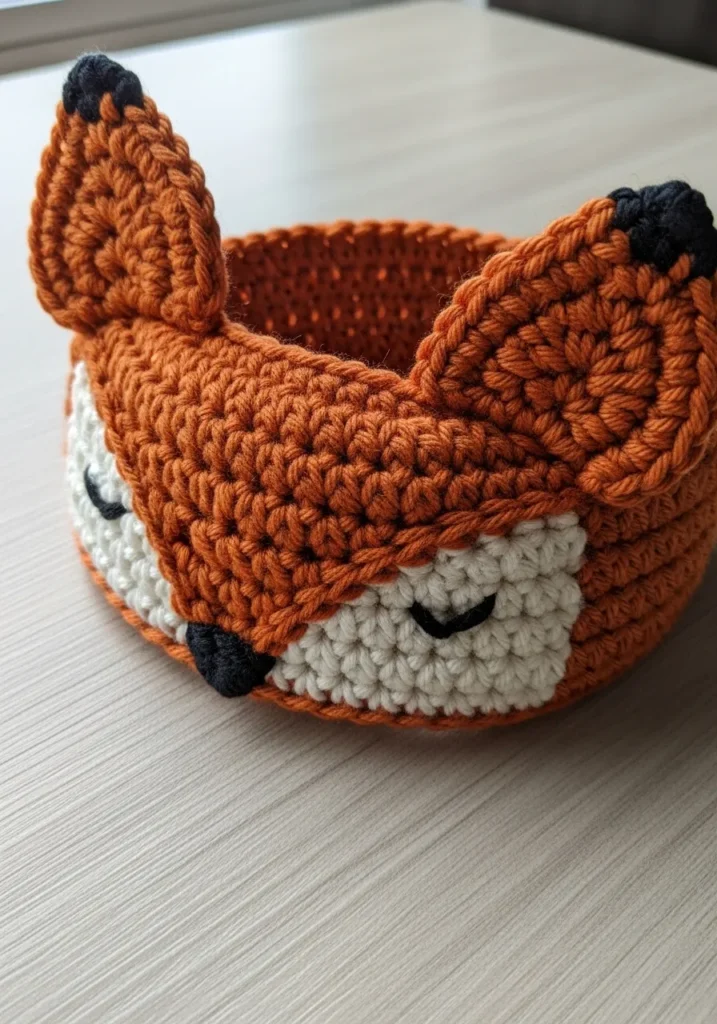 This warm rust colored crochet headband features adorable fox ears stitched right into the top, complete with tiny cream accents for the inner ear and a sweet embroidered face detail. The chunky stitches give it a cozy texture, and the playful shape makes it impossible to ignore.