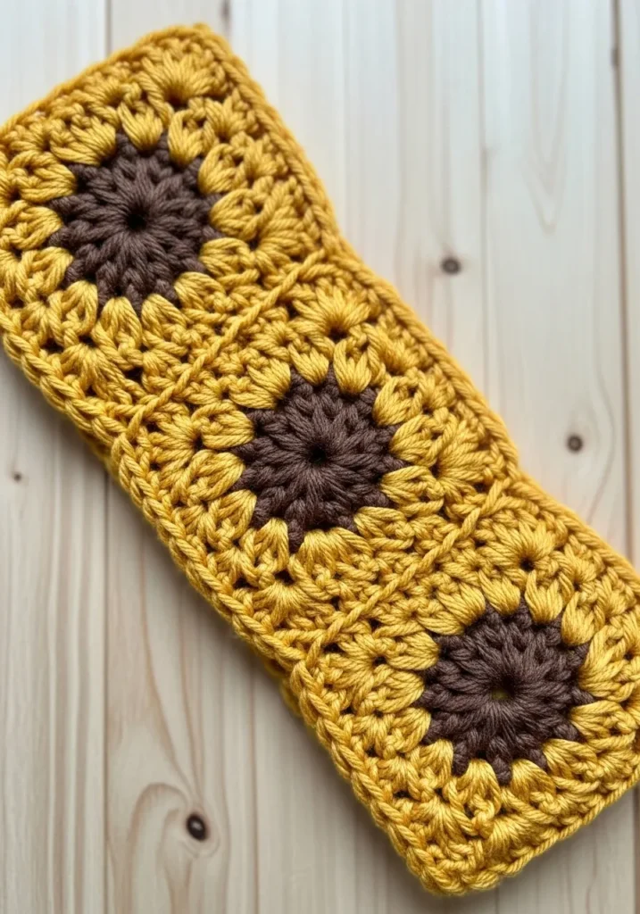 This cheerful crochet headband is made from classic granny squares in warm mustard yellow with rich brown sunflower centers. The stitches are chunky and textured, giving it that cozy handmade feel, and the squares are joined neatly to create a bold statement piece. The soft cotton yarn and visible stitch definition add charm and personality, especially laid out on a light wooden surface where the texture really stands out.