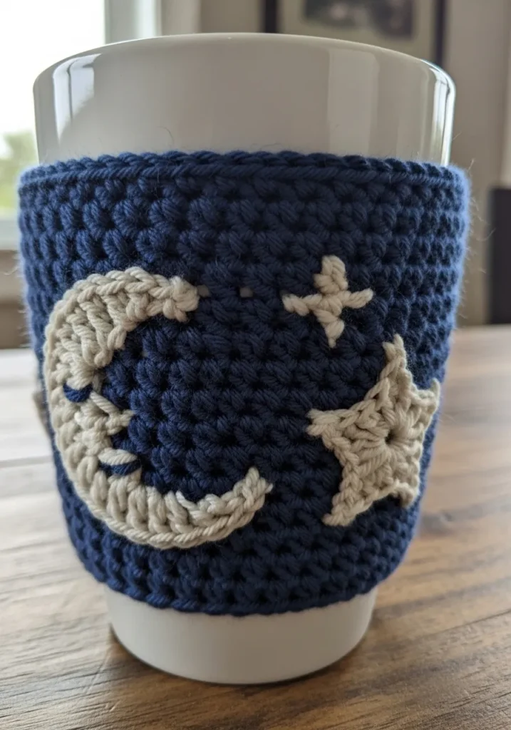 This deep blue crochet cup cozy wraps snugly around a mug and features a creamy crescent moon with tiny star appliqués stitched on top. The thick stitches add insulation, while the celestial design gives it a dreamy nighttime vibe. The contrast between the navy and cream makes the details stand out beautifully.