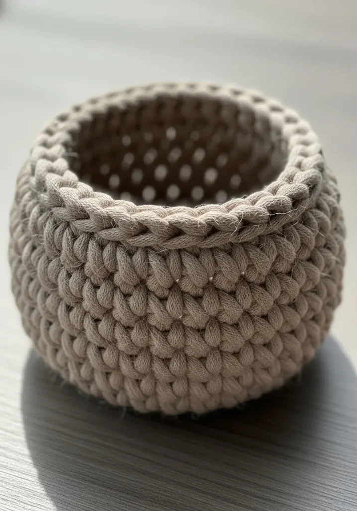 This small round basket is crocheted in thick beige yarn with bold, textured stitches that give it structure and durability. The clean shape and neutral tone make it versatile for holding small items like jewelry or clips. The chunky texture adds warmth and depth to the simple design.