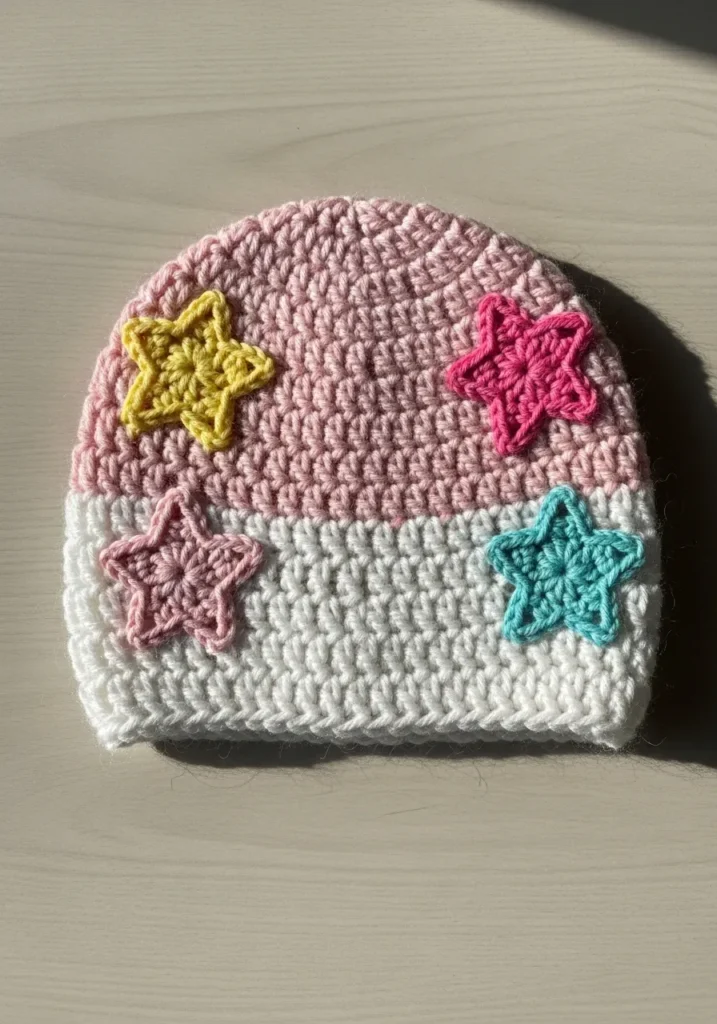 This adorable beanie is crocheted in soft blush pink and cream yarn with colorful star appliqués stitched across the front. The stitches are neat and slightly chunky, giving it warmth and structure while still looking soft and comfy. The bright little stars in yellow, pink, and teal add a cheerful pop of personality.