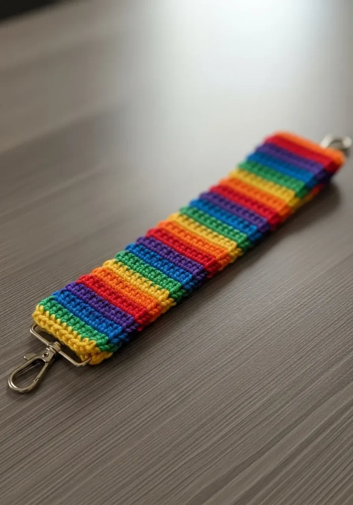 This slim crochet wristlet features bold rainbow stripes in vibrant red, orange, yellow, green, blue, and purple. The stitches are tight and uniform, creating a sturdy strap with a neat metal clasp at the end. The bright color transitions make it instantly eye catching against the neutral wooden background.