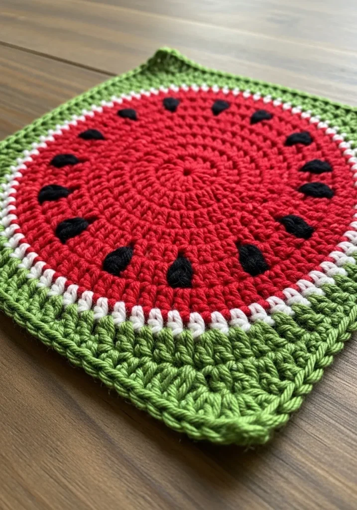 This playful granny square is designed to look like a juicy watermelon slice, complete with a bright red center, tiny black seed stitches, a white stripe, and a green rind border. The circular watermelon motif sits neatly inside a square frame, blending classic granny square style with a fun summer twist. The bold colors and textured stitches make it pop beautifully.