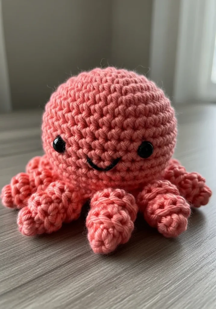 This tiny amigurumi octopus is crocheted in a soft coral pink yarn with sweet black stitched eyes and curly tentacles. The round body has even, tight stitches that give it a plush look, and the little legs curl naturally for extra cuteness. It looks perfectly squishy sitting on a wooden surface in soft light.