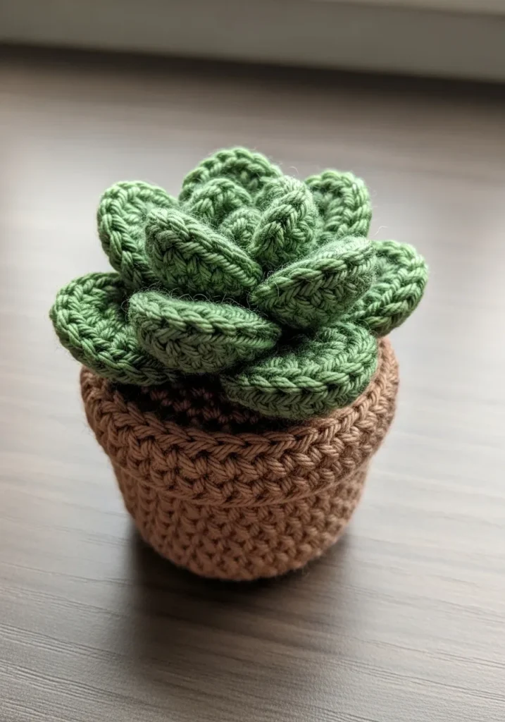 This charming little succulent is crocheted with layered green leaves arranged in a rosette shape and set inside a small brown textured pot. The leaves have gentle ridges that mimic real plant texture, and the pot has tight stitches for a sturdy base. It looks sweet and tidy placed on a tabletop.