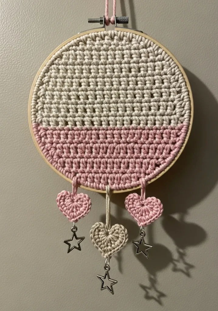 This simple round wall hoop features a soft cream upper half and a blush pink lower section, finished with tiny dangling crochet hearts and delicate star charms. The clean color blocking keeps it modern, while the textured stitches and gentle yarn variations give it that warm handmade touch. Displayed against a neutral wall, it feels light, sweet, and effortlessly stylish.