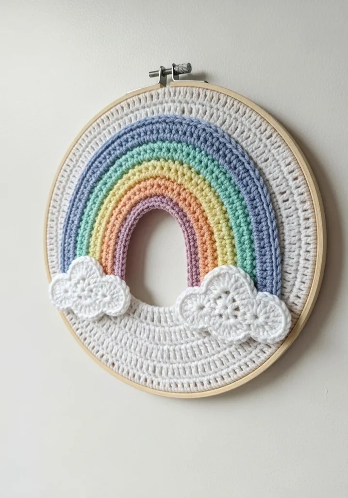 This crochet wall hoop showcases a soft pastel rainbow arched over fluffy white cloud shapes. The layered rows of color create a gentle gradient effect, and the tight stitches keep the design crisp and clean inside the round frame. Mounted against a neutral wall, it feels bright and uplifting.