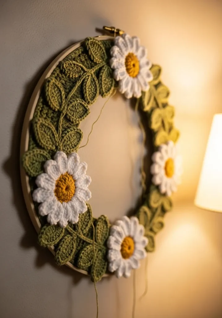 This circular crochet hoop is decorated with textured green leaves and bright white daisy flowers with sunny yellow centers. The floral elements are arranged like a wreath, creating a fresh garden inspired look. The detailed stitches add depth and dimension, especially in warm light.