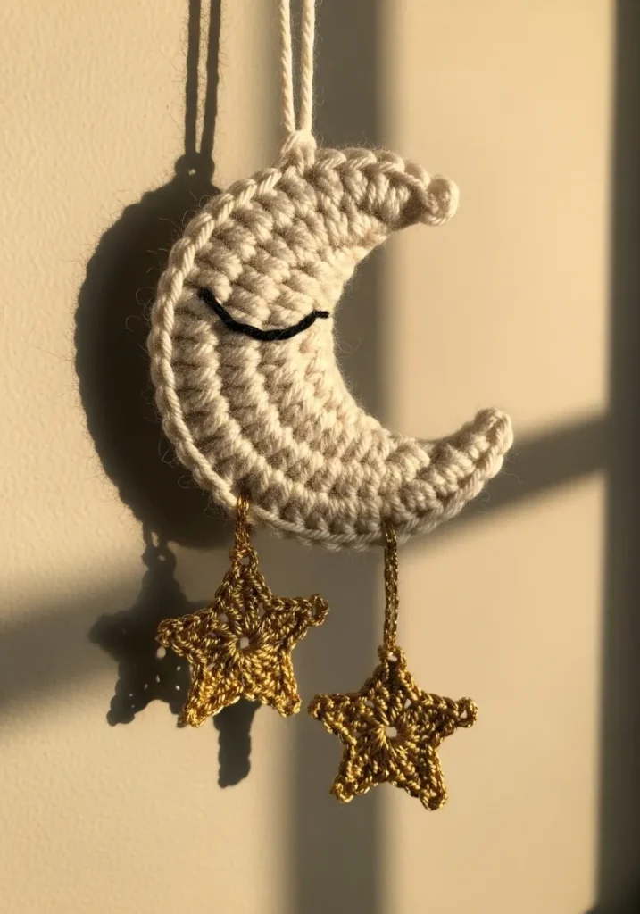 This crochet wall hanging features a softly curved crescent moon in creamy yarn with dangling golden star shapes below. The moon has defined ridged stitches that give it beautiful texture, and the hanging stars add movement and charm. Against a plain wall, it feels dreamy and calming.