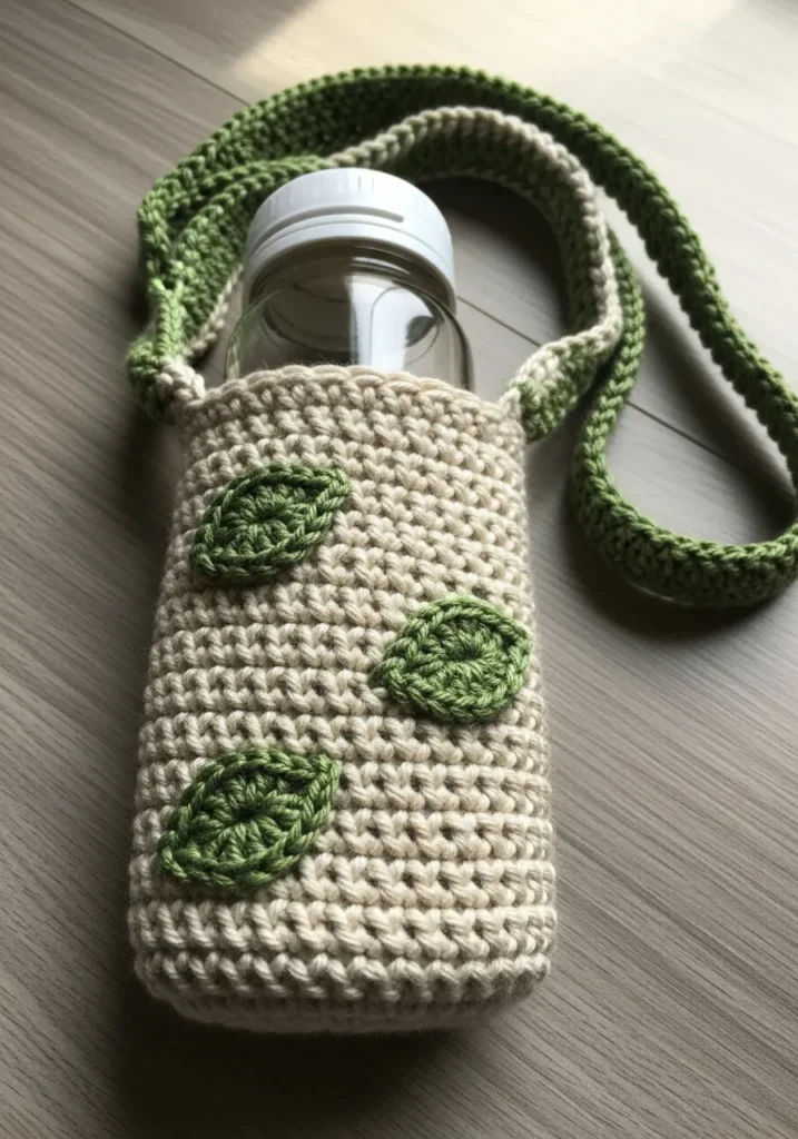 This crochet bottle holder is worked in a creamy beige yarn with leafy green appliqués stitched onto the body for a playful nature inspired look. The long strap makes it practical, and the sturdy textured stitches give it structure while still feeling soft and flexible. The green edging adds just enough contrast to make the leaves pop beautifully.