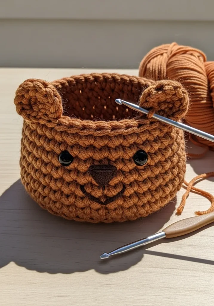 This chunky crochet basket is shaped like the sweetest little bear, complete with rounded ears and a stitched smiling face. Made with thick yarn, the stitches are bold and defined, giving it a sturdy structure that can hold small items. The warm brown tone adds to the cozy woodland vibe and makes it feel extra inviting.