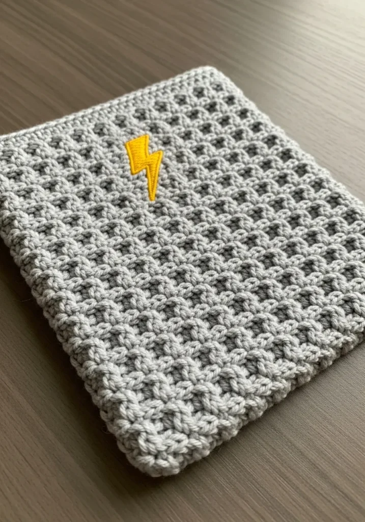 This crochet tablet sleeve features a beautiful waffle like stitch pattern in soft gray yarn, finished with a bright yellow lightning bolt appliqué for a fun pop of contrast. The texture adds thickness and protection, while the simple rectangular shape keeps it clean and modern. The bold bolt detail gives it just the right amount of playful energy.