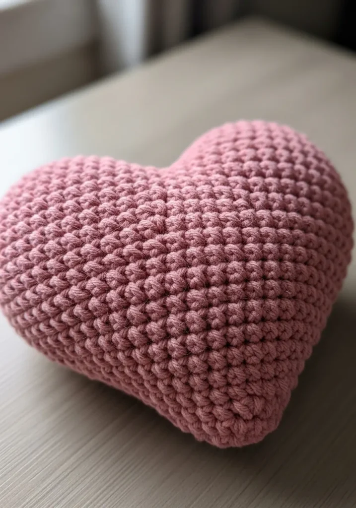 This plush heart shaped pillow is worked in soft pink yarn with tight, even stitches that create a smooth, squishy texture. The rounded curves are beautifully defined, and the gentle stuffing gives it a cozy handmade feel. It looks sweet and simple resting on a neutral surface.