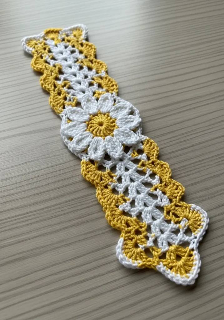 This delicate crochet bookmark features white daisy flowers with sunny yellow centers connected by airy lace stitches in soft yellow yarn. The floral motifs are evenly spaced and create a light, elegant strip that feels both whimsical and refined. The fine stitches show off lovely detail and texture.