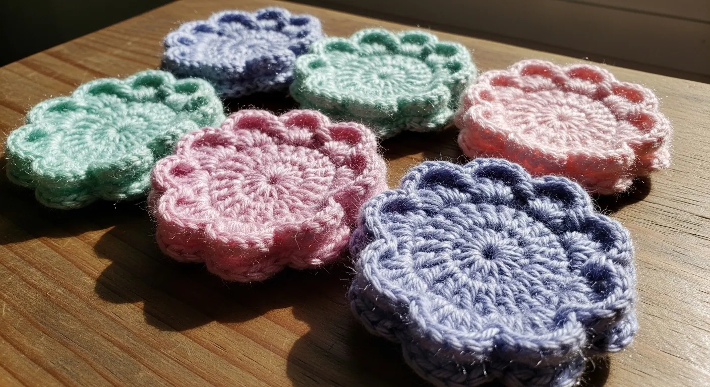 These sweet crochet coasters are shaped like blooming flowers in soft pastel shades of lavender, blush pink, mint green, butter yellow, and powder blue. Each one features rounded petal edges and a tightly stitched center that gives beautiful texture and dimension. The yarn looks plush and slightly fuzzy, which adds to that cozy handmade charm when displayed on a light wooden surface.