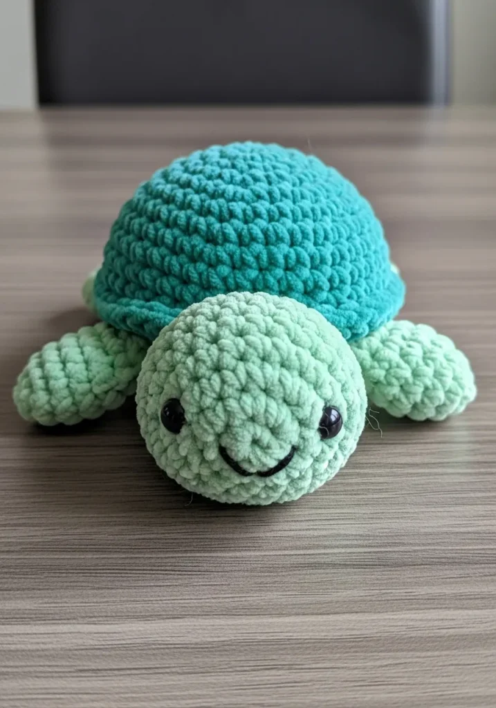 This sweet little crochet turtle is made with soft worsted weight yarn in calming shades of mint green and teal. The round shell is stitched in tight, even rows that create a cozy, slightly textured surface, while the tiny flippers and cheerful stitched smile give it so much personality. Its small black safety eyes add a cute sparkle, and the compact size makes it perfect for a desk buddy or a handmade gift. The simple shape and minimal color changes keep the design clean and beginner friendly.