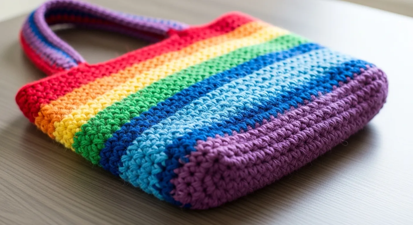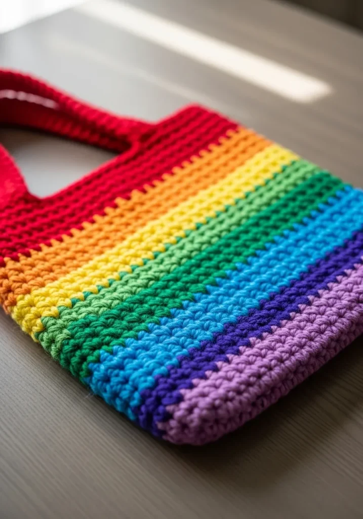 This crochet tote bag is made with vibrant rainbow stripes that blend from red through purple in bold, happy bands of color. The stitches are uniform and sturdy, creating a fabric that feels strong enough for everyday use. Wide handles are seamlessly attached, giving the bag a clean and functional design. The bright palette makes it an instant statement piece.