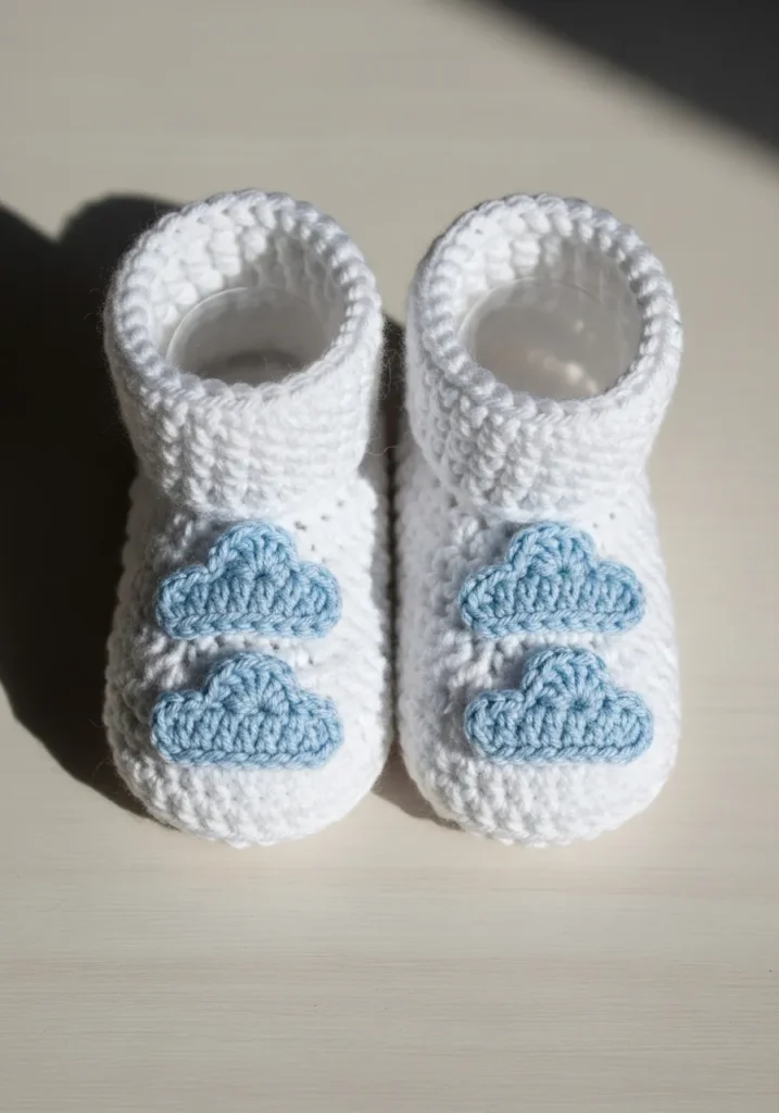 These tiny crochet baby booties are worked in soft white yarn with delicate light blue cloud appliqués stitched onto the front. The stitches are tight and even, giving them a sturdy yet cozy feel that is perfect for little feet. The ribbed cuffs add stretch so they slip on easily, while the rounded shape keeps them snug and adorable. The simple color combo makes them look fresh, clean, and timeless.