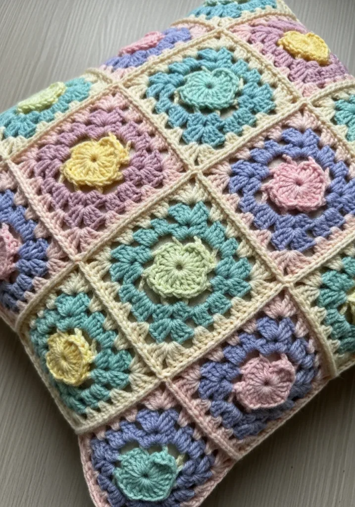 This pillow cover is made from an array of pastel granny squares in soft pink, mint green, baby blue, and buttery yellow. Each square features a raised floral center that adds gentle texture and dimension. The squares are neatly joined together to create a patchwork effect that feels both nostalgic and fresh. The soft yarn and muted tones give the whole piece a cozy handmade charm.