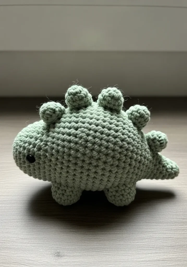 This adorable little dinosaur plush is crocheted in a soft sage green yarn with rounded spikes running along its back. The compact body is stitched in tight spirals, giving it that classic amigurumi texture that feels sturdy yet cuddly. Its small legs and curved tail add to the cute, cartoon inspired look. The muted green shade keeps it sweet and subtle rather than flashy.