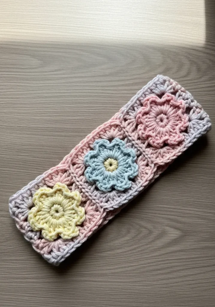 This soft crochet headband features a row of delicate granny style flowers in pastel pink, baby blue, and pale yellow, all joined together with a light neutral base. The flowers have a slightly raised center that gives them a sweet textured look, while the band itself is neatly stitched and stretchy enough to sit comfortably around the head. The color palette feels airy and cheerful, almost like a little spring garden wrapped into wearable form.