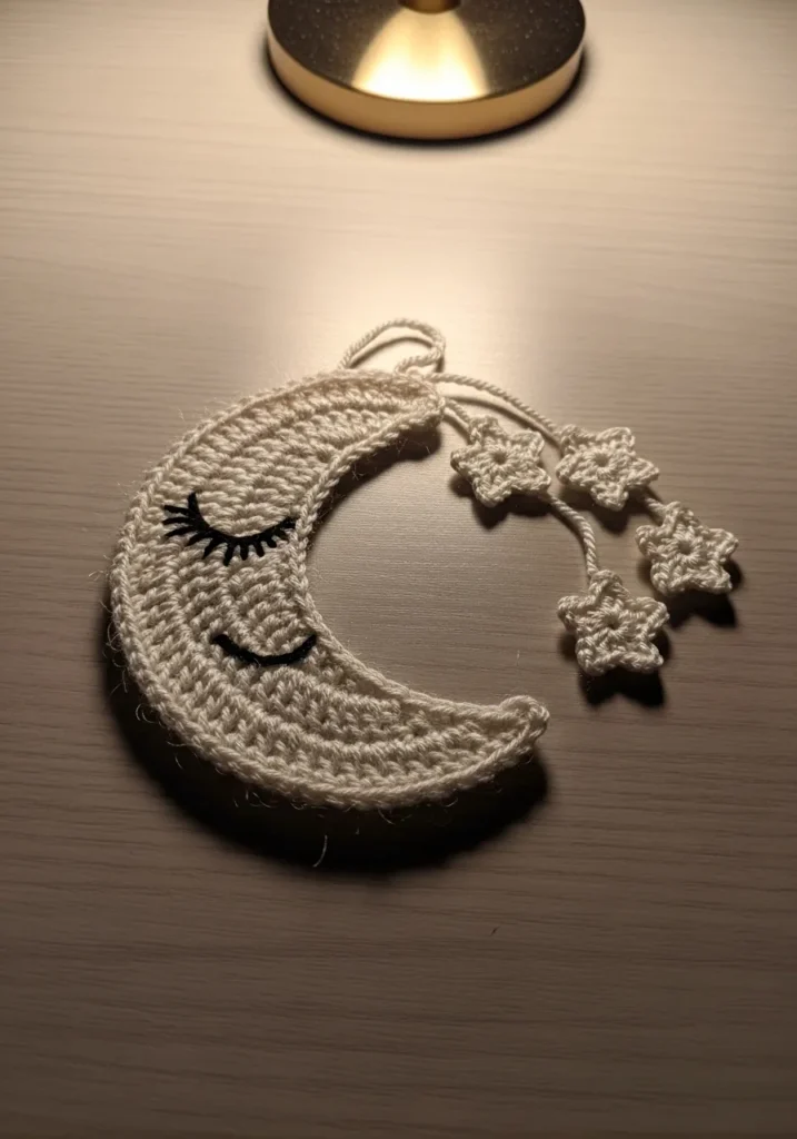 This crescent moon wall hanging is crafted in a soft cream yarn with tight, even stitches that give it a smooth and polished shape. A tiny dangling star adds a whimsical touch, and the gentle curve of the moon creates a calm, dreamy vibe. The neutral color keeps it versatile, making it easy to fit into a nursery, bedroom, or cozy reading corner. The simple rope loop at the top makes it ready to hang anywhere.
