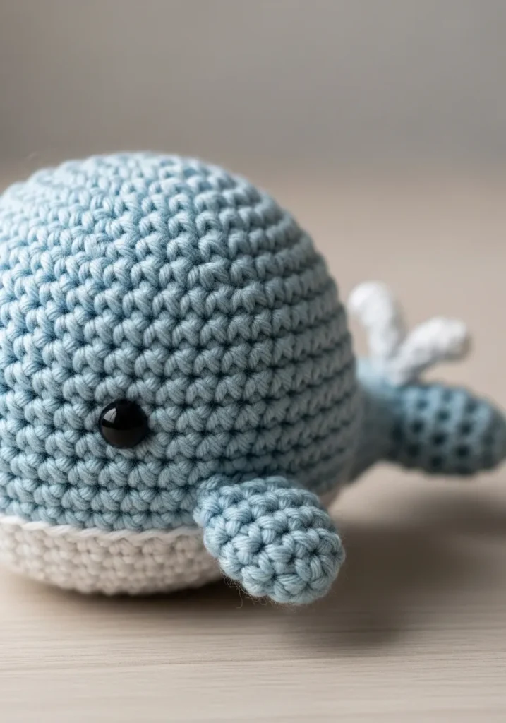 This small whale plush is stitched in a soft pastel blue yarn with a contrasting white underside. The rounded body and tiny side fins give it a smooth, cuddly silhouette, and the little black safety eyes bring it to life. The texture is slightly nubby in that classic amigurumi style, which makes it feel both sturdy and squeezable. Its compact size makes it perfect for a shelf, a nursery, or even as a keychain with a small loop added.