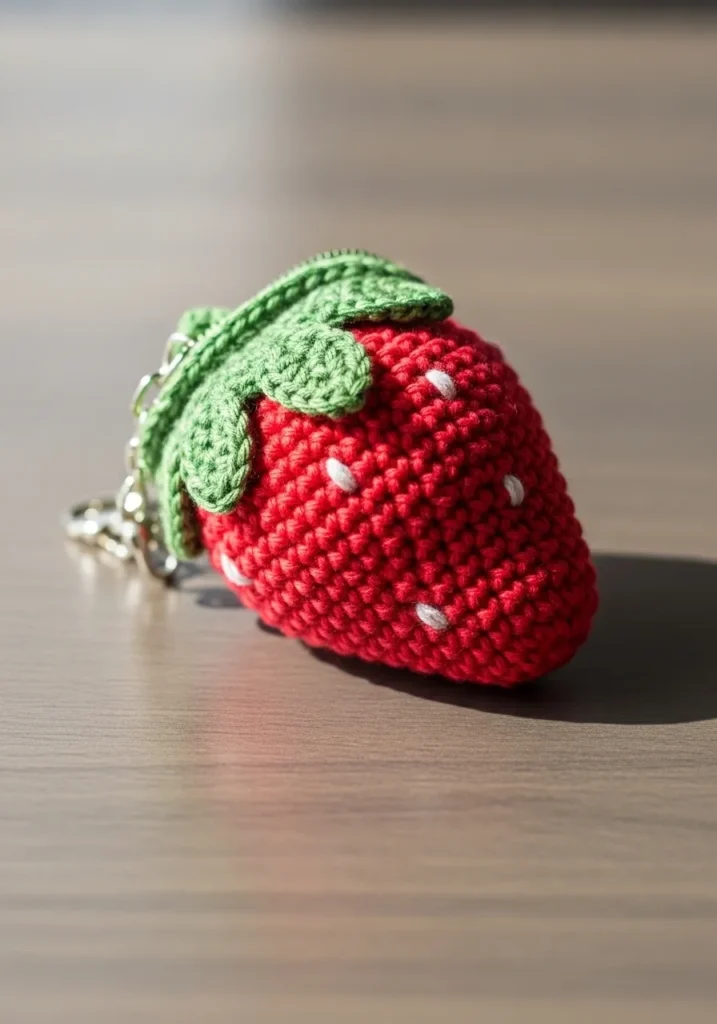 This tiny crochet strawberry is stitched in bright red yarn with small white accents that mimic seeds, topped with a leafy green cap. The shape is rounded and slightly plump, giving it a playful and realistic look. The tight stitches create a firm texture that holds its shape nicely, while the attached keyring turns it into a charming accessory. It is small, colorful, and full of personality.