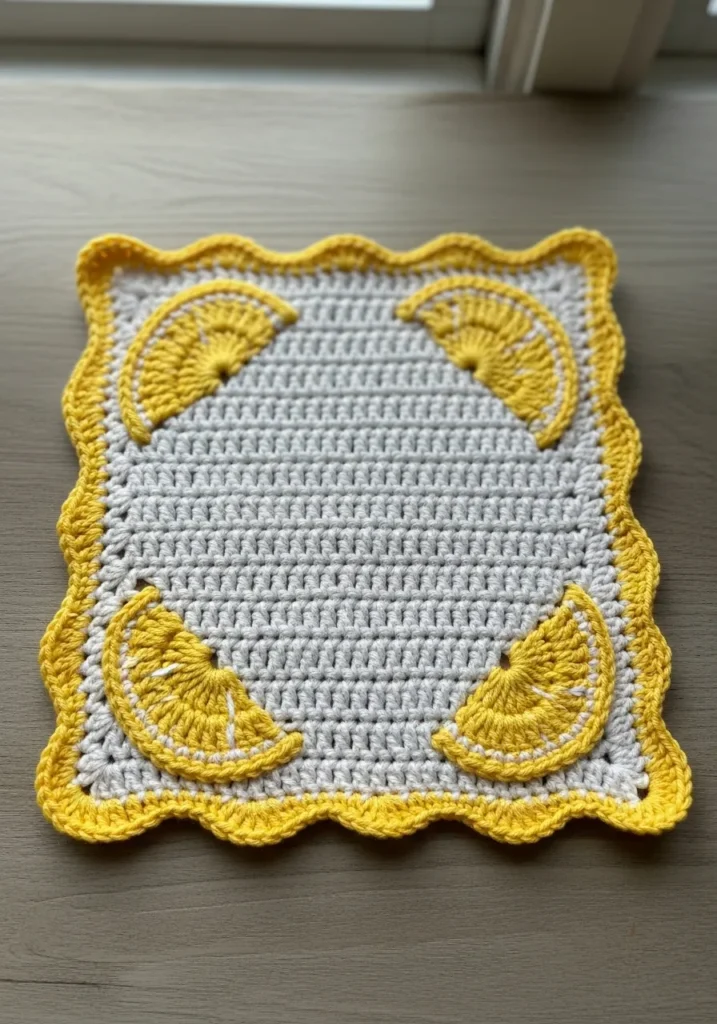 This cheerful crochet coaster features a white center framed by bright yellow lemon slice details in each corner. The scalloped yellow border adds a playful edge that makes the square shape feel extra special. The stitches are neat and consistent, giving the coaster a sturdy yet soft texture. The bold contrast between the white and yellow keeps it fresh and summery.