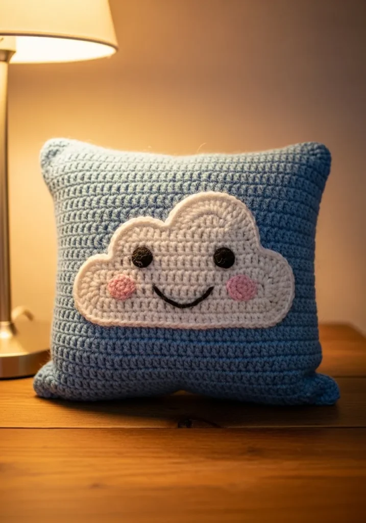 This cozy square crochet pillow is worked in soft blue yarn with a large white cloud applique stitched onto the front. The cloud has rosy cheeks and a sweet stitched smile, giving the whole pillow a playful personality. The textured stitches add depth while keeping the design simple and beginner friendly.