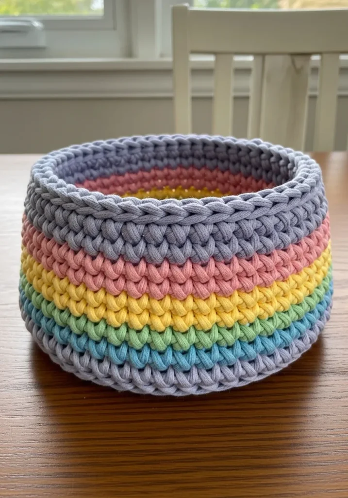 This cheerful crochet basket is worked in thick, chunky yarn with soft pastel rainbow stripes layered between light gray rounds. The stitches are bold and slightly textured, giving the basket a sturdy yet cozy feel. Its cylindrical shape holds nicely on its own, and the colorful bands add a playful touch that brightens up any shelf or desk.