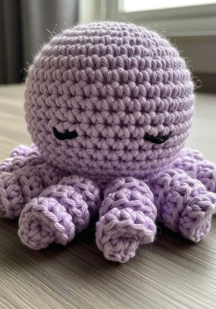 This adorable octopus is crocheted in soft lavender yarn with plump, rounded stitches and tiny stitched sleepy eyes. The tentacles curl slightly at the ends, adding texture and charm without looking complicated. The overall shape is smooth and cuddly, perfect for a beginner stuffed toy.