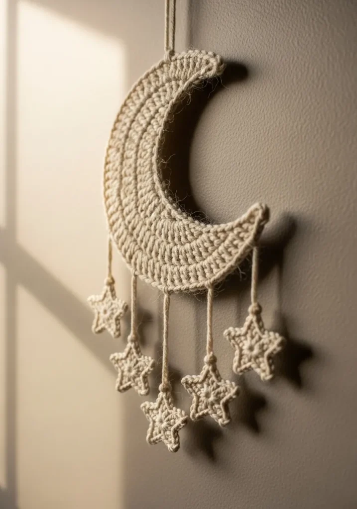 This delicate crochet wall hanging features a textured crescent moon in soft neutral yarn with tiny dangling star shapes below. The stitches create a lovely pattern across the moon, and the hanging strands add gentle movement. The overall look is calm, cozy, and slightly dreamy.