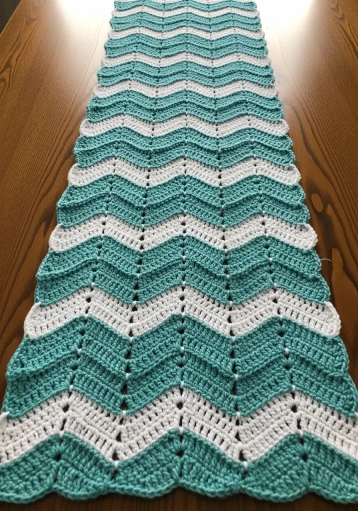 This long crochet blanket showcases a classic chevron pattern in soothing shades of teal and white. The zigzag rows create a rhythmic design that looks intricate but is built from basic stitches. The yarn appears soft and slightly textured, giving the blanket a cozy and inviting feel.