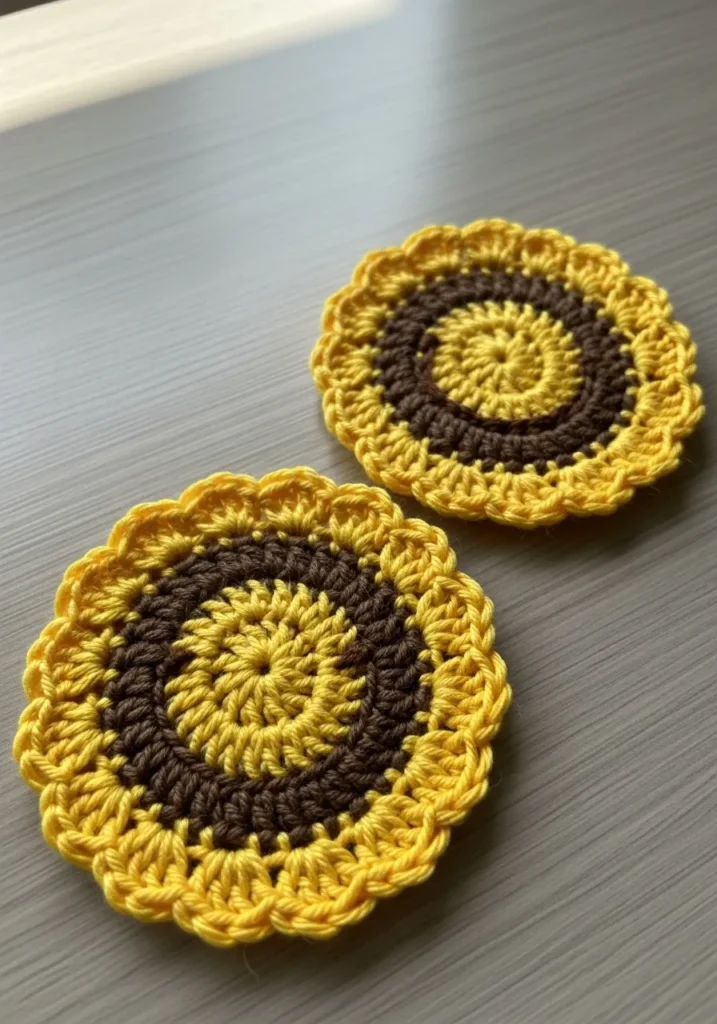 These round crochet coasters feature a warm golden center surrounded by textured brown and yellow rounds that resemble a cheerful sunflower. The layered stitches create a slightly raised floral effect, and the scalloped edge adds a playful finish. The yarn looks soft yet sturdy enough for everyday use.