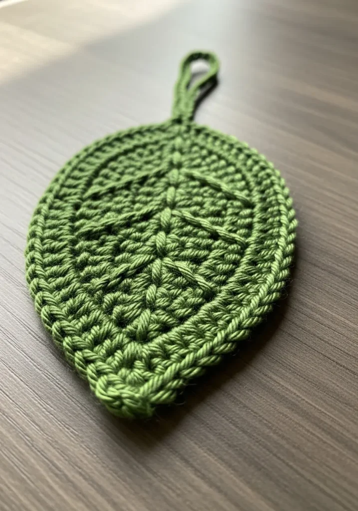 This larger crochet leaf is worked in a soft green yarn with clear vein detailing and a sturdy thickness. The rounded edges and pointed tip give it a natural silhouette, and the texture adds both beauty and function. It looks charming while still being practical for everyday kitchen use.