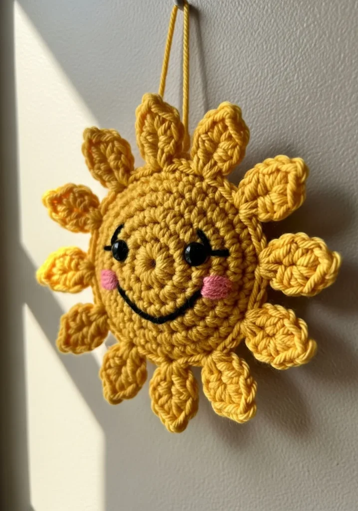 This crochet wall hanging features a bright golden sun with chunky textured stitches and sweet embroidered details. The round center has stitched sleepy eyes and rosy cheeks, while soft petal shaped rays surround the edge for a playful look. The yarn appears cozy and slightly fuzzy, giving it that handmade charm that feels warm and inviting against a neutral wall.