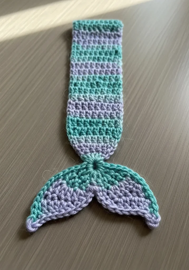 This crochet bookmark is shaped like a whimsical mermaid tail in soft pastel stripes of lavender and mint. The textured stitches define the tail fin beautifully while the slim body keeps it lightweight. It feels delicate but still playful.