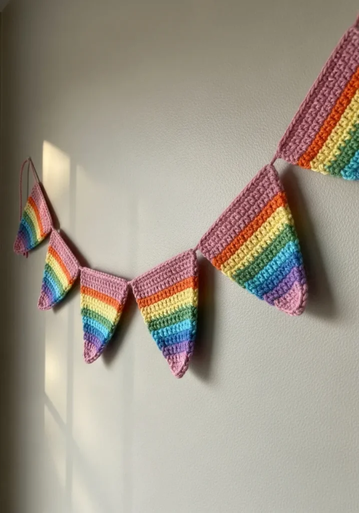 This crochet bunting features small triangle flags stitched in bright rainbow stripes and strung together for a festive look. The simple shape keeps it beginner friendly while the bold colors make it eye catching against a neutral wall. It feels cheerful and celebratory.