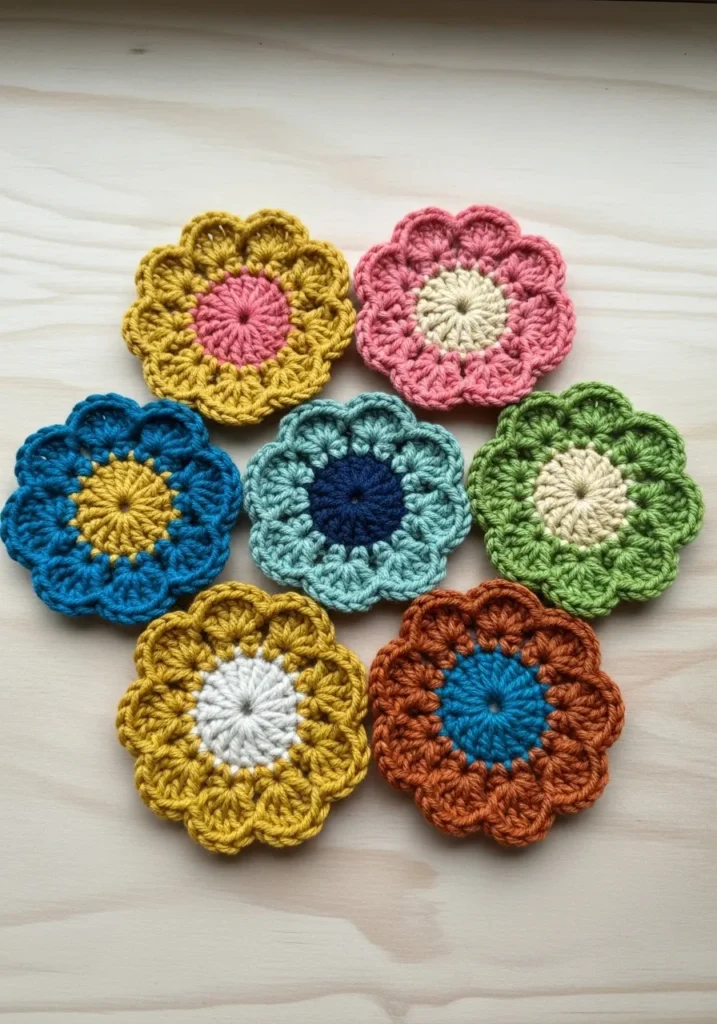 These crochet coasters are shaped like layered flowers in bold shades of mustard, blush, teal, coral, and soft blue. Each one has a contrasting circular center and scalloped petal edges that give them a cheerful, dimensional look. The stitches are slightly textured, adding that cozy handmade feel while the cotton yarn keeps them practical for everyday use.