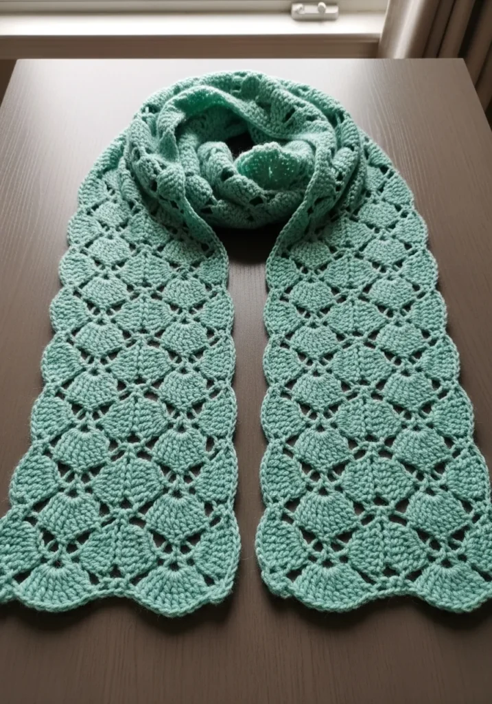 This airy crochet scarf is worked in a soft mint green with a repeating shell stitch pattern that creates delicate openwork texture. The edges have a subtle scalloped finish, and the lightweight yarn gives it a graceful drape. It feels elegant but still relaxed and wearable.