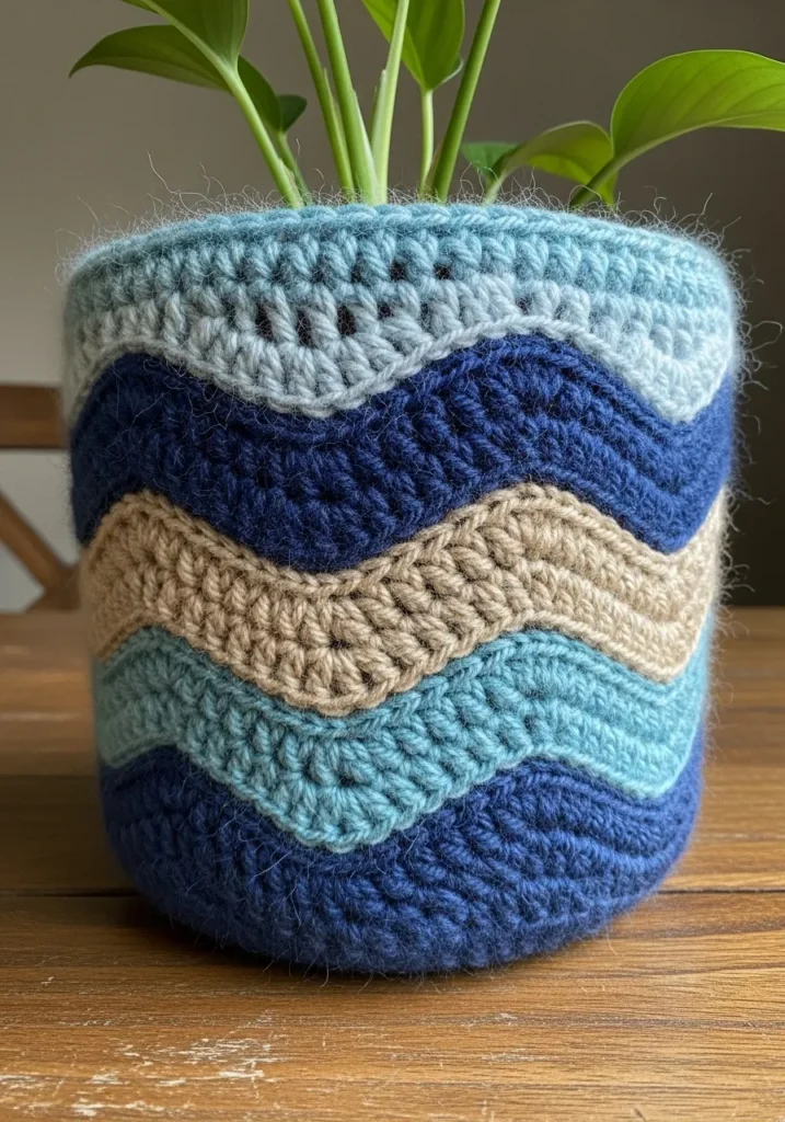 This crochet plant pot cover features bold wavy stripes in shades of navy, sky blue, and sandy beige. The raised ripple pattern adds depth and movement, making the simple cylindrical shape feel playful and modern. The sturdy yarn gives it structure while still looking soft and inviting.